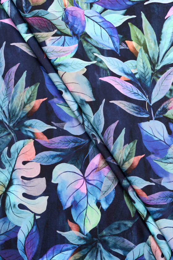 Taliansky hodvábny satén s prídavkom elastanu s motívom farebných listov na tieňovanom čiernom a námornícky modrom pozadí. Vzor je vyrobený v morských a zelených farbách, krásne obohatený o neónové akcenty vo fialovej, ružovej a zelenej farbe. Látka je mäkká, elastická a krásne sedí. Vytlačené na matnej strane. Je ideálny na šitie originálnej košele, šiat alebo sukne.