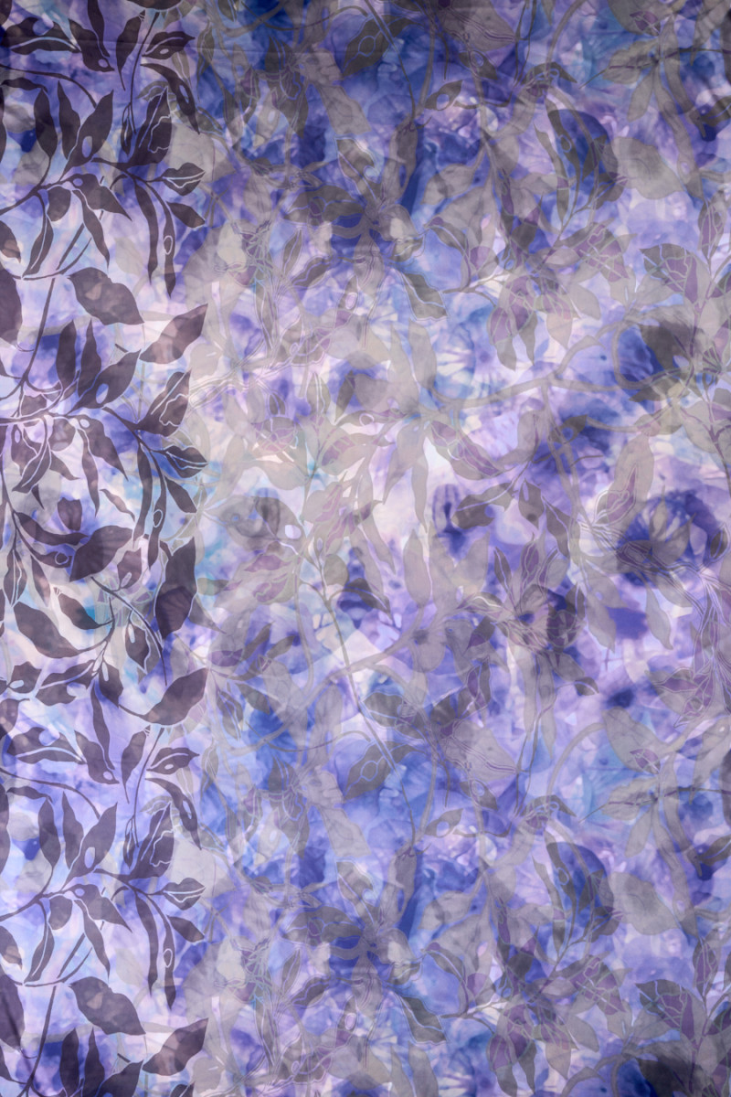 Taliansky hodvábny satén s prídavkom elastanu na tieňovanom fialovo-modrom pozadí sú rozmazané sivé listy, ktoré sa zaostrujú pozdĺž jedného okraja. Vzor je navyše obohatený o akcenty vo veľmi svetlofialovej farbe, ktoré jemne osvetľujú celý materiál. Látka je mäkká, elastická a krásne sedí. Ideálny návrh v tlmených farbách pre ľudí, ktorí majú radi elegantné a nadčasové farebné kombinácie.
