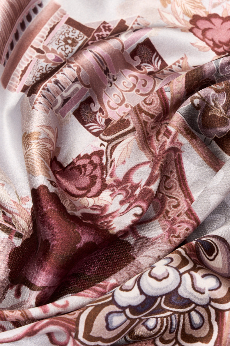Taliansky hodvábny satén s prídavkom elastanu s čínskymi motívmi na sivom a krémovom pozadí. Hustý vzor v odtieňoch hnedej a bordovej obsahuje čínske budovy, kvety a draky, ako aj štvorcové a okrúhle rámy, ktoré dotvárajú celú grafiku. Hodvábny satén je hustá a ľahká tkanina s rovným povrchom, prídavok elastanu ho robí pohodlnejším na nosenie a menej sa krčí. Je ideálny na šitie originálnej košele, šiat, sukne a vzdušného kimona.
