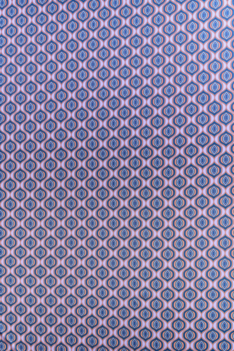 Taliansky hodvábny satén s prídavkom elastanu s pravidelným vzorom pávích očí na fialovom pozadí. Husto usporiadané motívy s rozmermi 5 cm x 5 cm v svetlohnedej, modrej a šedej farbe. Hodvábny satén je hustá a ľahká tkanina s rovným povrchom, prídavok elastanu ho robí pohodlnejším na nosenie a menej sa krčí. Je ideálny na šitie krásnej košele, sukne a voľnejších nohavíc.