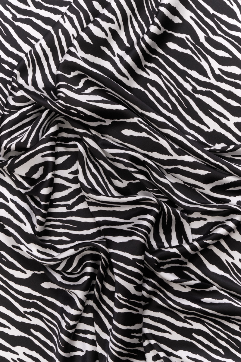 Taliansky hodvábny satén s prídavkom elastanu v čiernobielom motíve stredne veľkej zebry. Tkanina je elastická, splývavá, jemná na dotyk, mäkká a nepriehľadná. Klasický, nadčasový dizajn, z ktorého sa dá vykúzliť jemná košeľa, vzdušná sukňa alebo šaty.