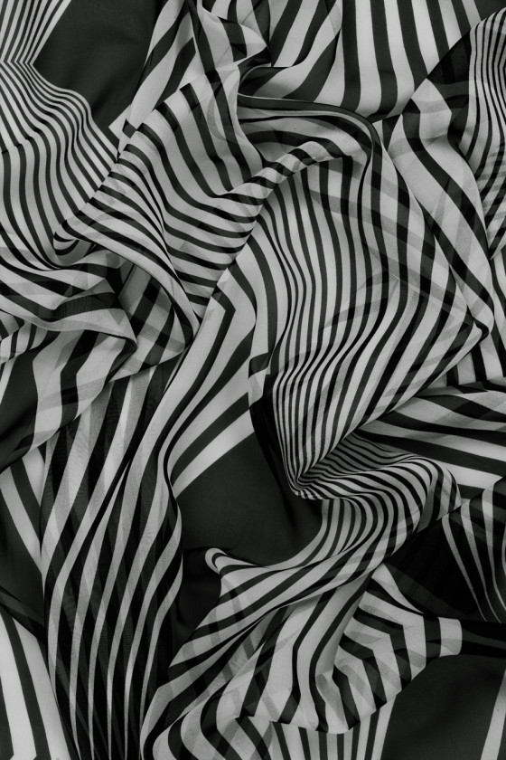 Taliansky šifón 100% hodváb s čiernobielymi geometrickými veľkými vzormi. Látka je vzdušná, ľahká, priehľadná a matná. Pochádza zo známej kolekcie módnej značky. Šifón je ideálny na šitie vzdušných šiat, sukne, ale aj košele alebo blúzky.