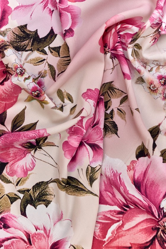 Talianska georgette 100% hodváb s veľkými ružovými koralovými kvetmi na tieňovanom ružovom a krémovom pozadí. Tkanina je veľmi ľahká, vzdušná, neelastická, matná a polopriehľadná. Krásna ponuka v tlmených farbách pre tých, ktorí majú radi elegantné a nadčasové farebné kombinácie. Tkanina určená na šaty alebo sukne.