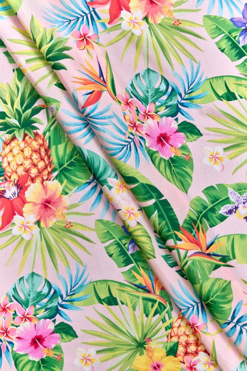 Talianske habotai 100% hodváb s tropickými, farebnými vzormi na svetloružovom pozadí. Husté motívy listov, kvetov a ananásov v sviežich letných farbách. Látka je veľmi ľahká, vzdušná, neelastická, zakončená veľmi jemným leskom. Radostný a ľahký návrh, ktorý bude ideálny na šitie blúzky, košele, šiat alebo tuniky.