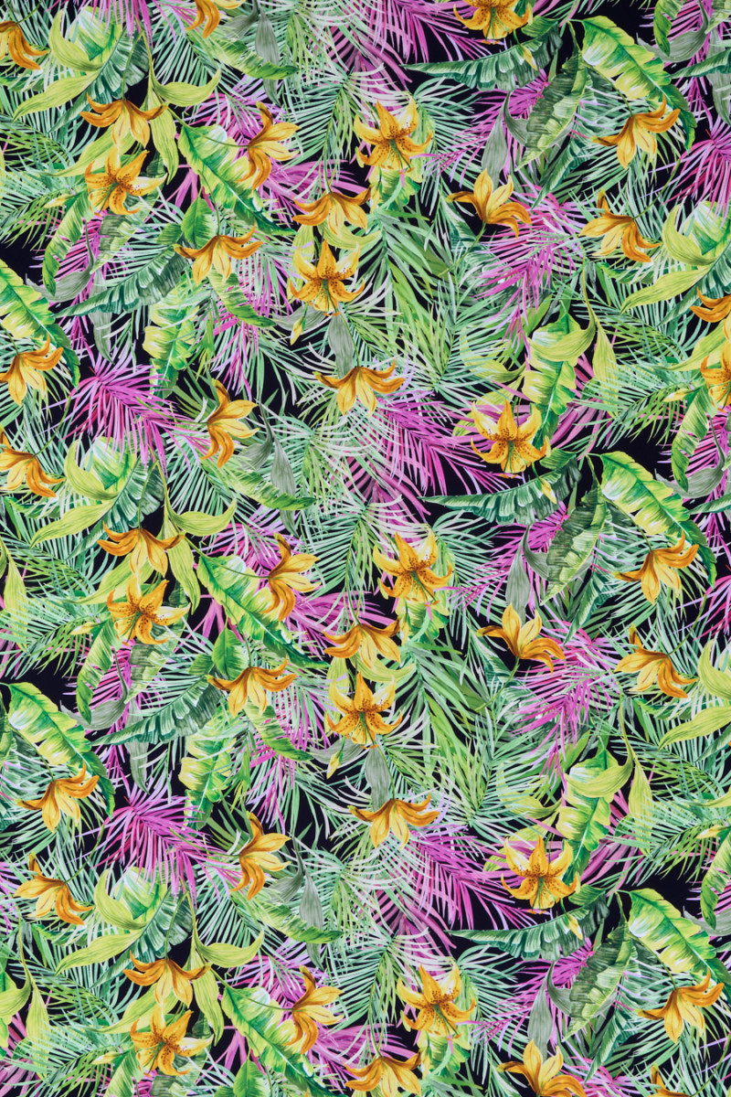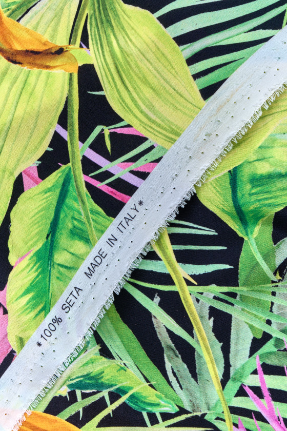 Taliansky krep 100% hodváb s motívom tropickej vegetácie na čiernom pozadí. Veľmi hustý vzor v energických zelených a žltých farbách s ružovými akcentmi. Látka je veľmi ľahká, vzdušná, neelastická, zakončená veľmi jemným leskom. Jedinečný návrh, ktorý bude ideálny na šitie blúzky, košele, šiat alebo tuniky.