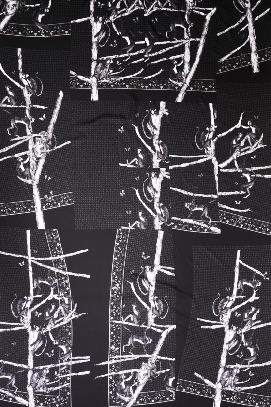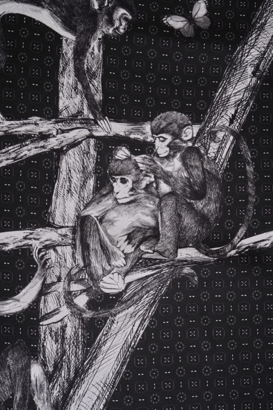 Talianska 100% hodvábna keprová tkanina s motívom šedej opice na grafitovom podklade vyplnenom drobným vzorom. Látka sa dodáva v kupóne dlhom 230 cm a pozostáva z hotových prvkov, ktoré sa majú rezať. Materiál je tenký, ale nepriehľadný s jemnou keprovou väzbou, neelastický a pochádza zo zbierky známeho módneho domu. Fantastický návrh pre fanúšikov zvieracích dizajnov, ktorí hľadajú originalitu a výnimočnosť.
