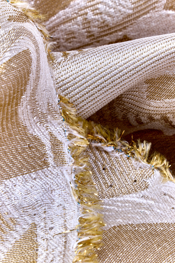 Talianska žakárová tkanina s hodvábom so smotanovými aztéckymi vzormi na zlatom pozadí. Vzor je pomerne hustý, veľký a krásne sa trblieta. Tkanina je tenká, neelastická, mierne priehľadná, veľmi ľahká a vzdušná. Jedinečná ponuka, z ktorej si môžete vykúzliť šaty, sukňu, tuniku, ale aj šál či šatku.