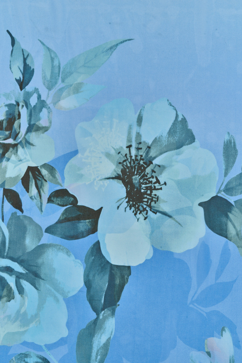 Taliansky šifón 100% hodváb s motívom veľkých modrých kvetov na modrom pozadí. Látka sa dodáva v kupónoch s rozmermi 140 cm * 135 cm. Materiál je ľahký, vzdušný, priehľadný, neelastický a matný. Romantický návrh ideálny pre vzdušné šaty, sukne, ale aj blúzky a šatky.