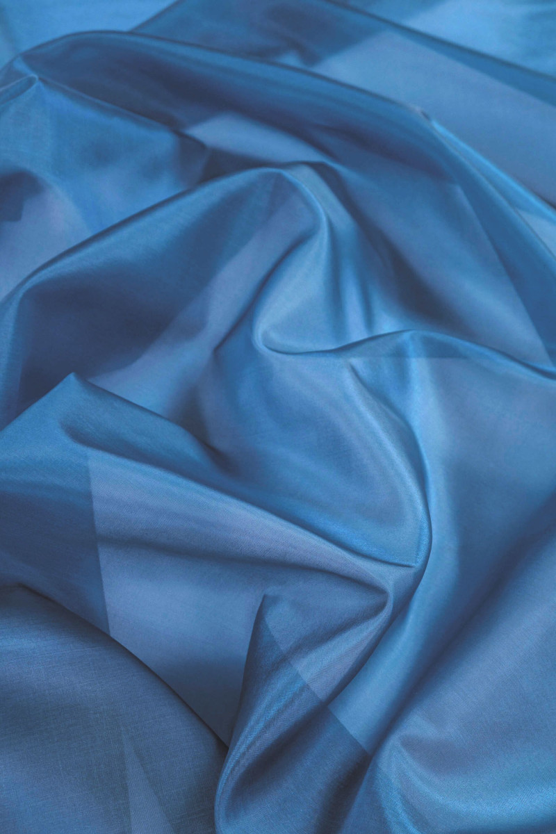 Talianska 100% hodvábna organza v modrej farbe. Prírodná hodvábna organza je tenká, priehľadná, ale tuhá tkanina s jemným leskom charakteristickým pre hodvábne tkaniny. Ideálne na šitie šiat, blúzky, košele, sukne.