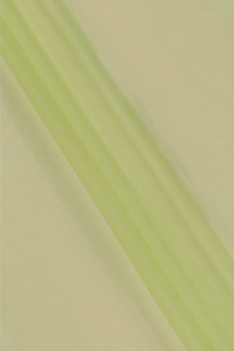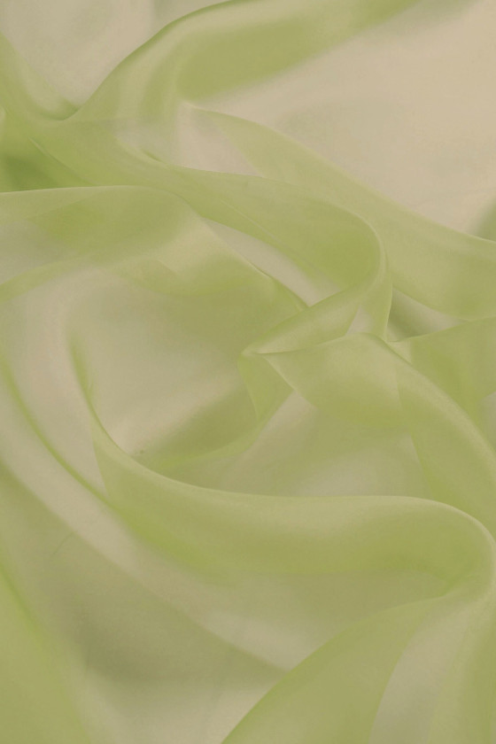 Talianska 100% hodvábna organza v kiwi zelenej. Prírodná hodvábna organza je tenká, priehľadná, ale tuhá tkanina s jemným leskom charakteristickým pre hodvábne tkaniny. Ideálne na šitie šiat, blúzky, košele, sukne.