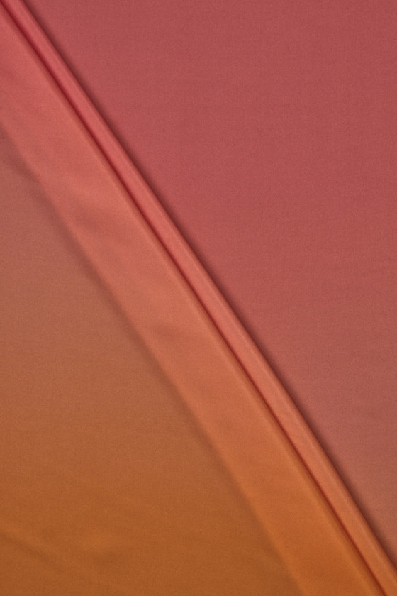 Taliansky 100% hodvábny satén s efektom ombre v ružovej a oranžovej farbe. Vzor vytlačený na matnej strane prechádza od oranžovej na jednom okraji látky až po ružovú na druhom okraji - odporúčame šiť po obvode. Látka je splývavá, mäkká, veľmi príjemná na dotyk a neelastická. Krásny návrh v energických farbách na šaty, sukne a košele.