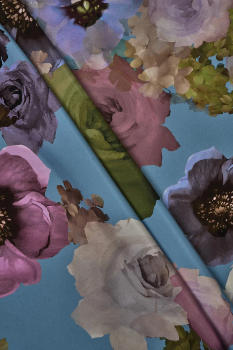 Taliansky 100% hodvábny satén s motívom veľkých, pastelových kvetov na modrom pozadí. Jemný veľký vzor vyrobený na matnej strane, najväčší kvet je 20 cm * 20 cm. Kvetinové motívy v pokojných farbách prechádzajú od intenzívnejších farieb z jedného okraja látky až po bledé na druhom okraji - odporúčame šiť po obvode. Látka je splývavá, mäkká, neelastická a veľmi príjemná na dotyk. Je ideálny na vzdušné šaty, sukne, ale aj blúzky a tuniky.