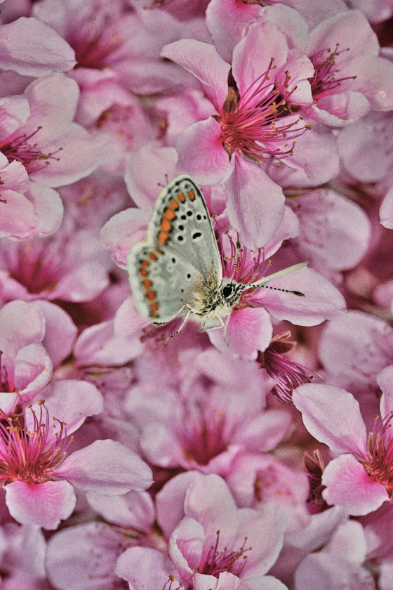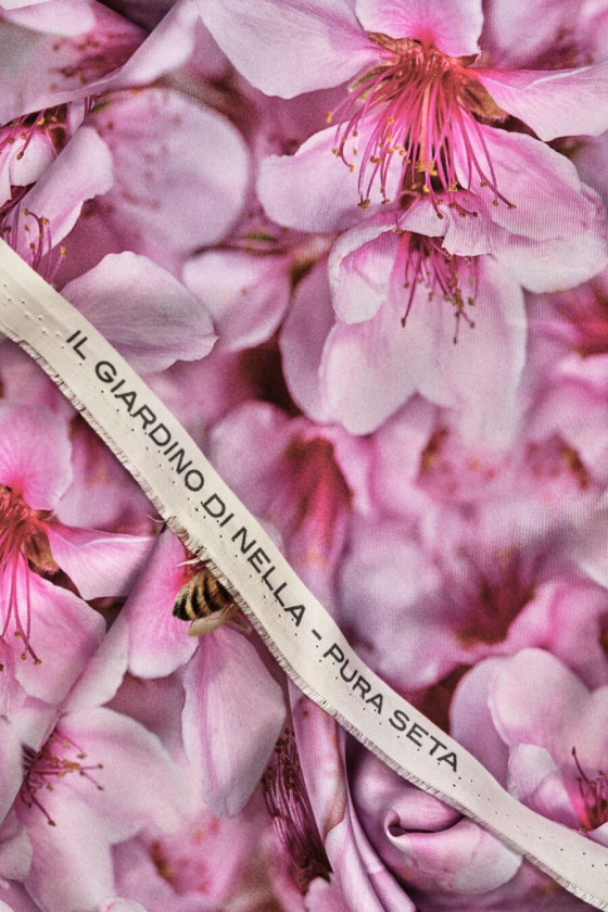 Talianska 100% hodvábna keprová látka s motívom ružových kvetov a hmyzu. Jasný vzor, ktorý vyzerá ako fotografia s pravidelne sa opakujúcimi motýľmi a osami. Látka je ľahká, nepriehľadná, neelastická, zakončená jemným leskom. Zaujímavý návrh, z ktorého môžete vykúzliť košeľu, šaty, sukňu alebo blúzku.