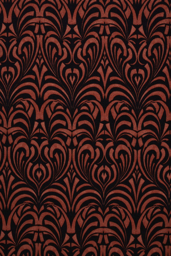 Taliansky hodvábny satén s prídavkom elastanu s orientálnymi motívmi v červeno-oranžovej farbe na tmavomodrom pozadí. Veľmi hustý a pravidelný vzor v krásnych jesenných farbách, ktorý vyzerá dôstojne. Látka je splývavá, mäkká, elastická a krásne lesklá, čo jej dodáva eleganciu. Jedinečná ponuka, ktorá bude dobre fungovať pri šití vzdušných šiat, sukní, ale aj blúzok a košieľ.