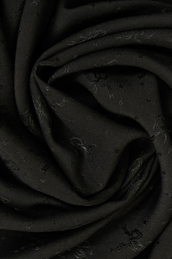 Talianska hodvábna látka v čiernej farbe. Látka má pevnú štrukturálnu väzbu s hustým vzorom mašlí (2 cm) a malými bodkami. Je tenký, ale nepriehľadný, vzdušný a elastický. Fantastický návrh na šitie ľahkej blúzky, košele alebo šiat. Ak máte radi ušľachtilé látky v nadčasovej farbe, toto je látka práve pre vás.