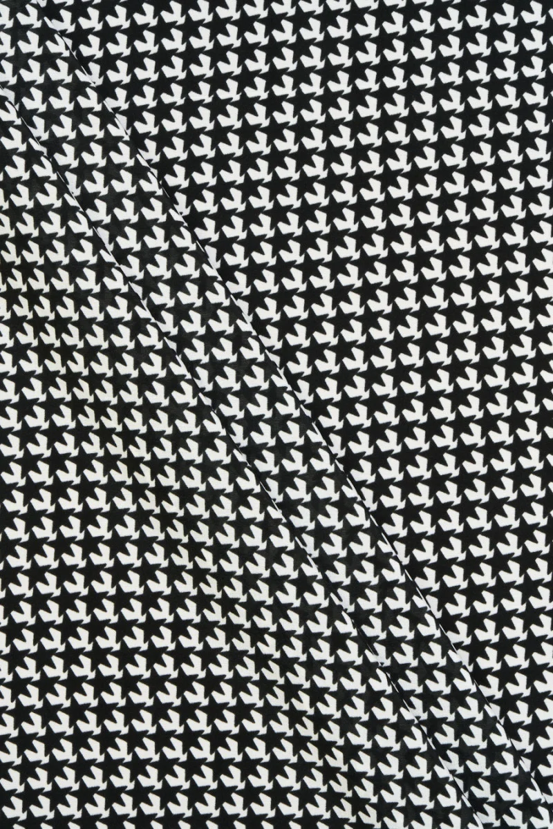 Taliansky 100% hodvábny krep s motívom malých čiernych hviezdičiek na bielom pozadí. Pravidelný a hustý dizajn, kde jedna hviezda je 1,4 cm * 1,4 cm. Látka je ľahká, tenká, neelastická, matná a jemne závesná. Ideálne na blúzky, košele a vzdušné šaty a sukne.