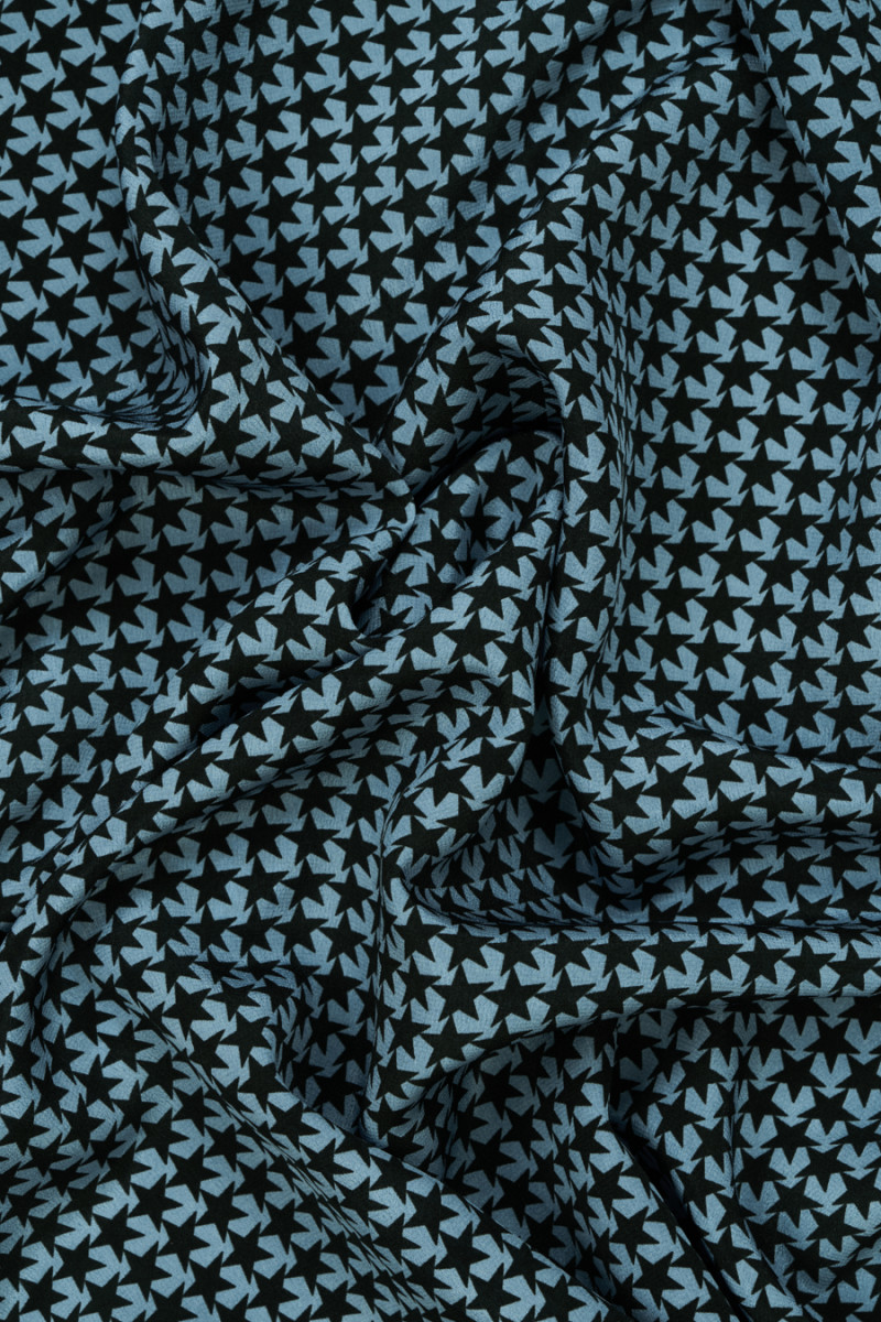 Taliansky 100% hodvábny krep s motívom malých čiernych hviezdičiek na modrom pozadí. Pravidelný a hustý dizajn, kde jedna hviezda je 1,4 cm * 1,4 cm. Látka je ľahká, tenká, neelastická, matná a jemne závesná. Ideálne na blúzky, košele a vzdušné šaty a sukne.