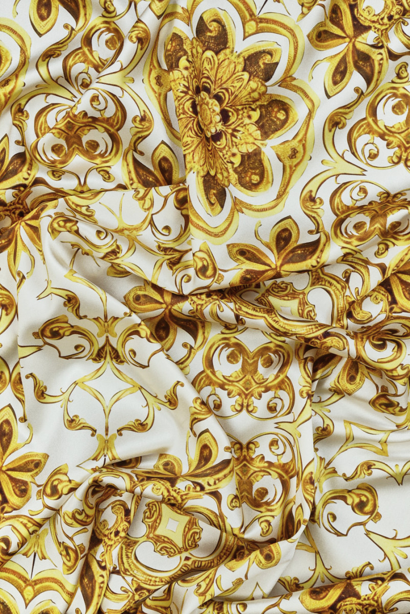 Taliansky hodvábny satén s prídavkom elastanu so žltým orientálnym motívom na krémovom pozadí. Hustý, pravidelný vzor, charakteristický pre známy módny dom. Materiál je splývavý, pružný, nepriehľadný, mäkký a zakončený krásnym leskom. Vynikajúca ponuka pre ľudí, ktorí hľadajú podpísané látky. Bude dobre fungovať na košeliach, blúzkach, vzdušných šatách a sukniach.