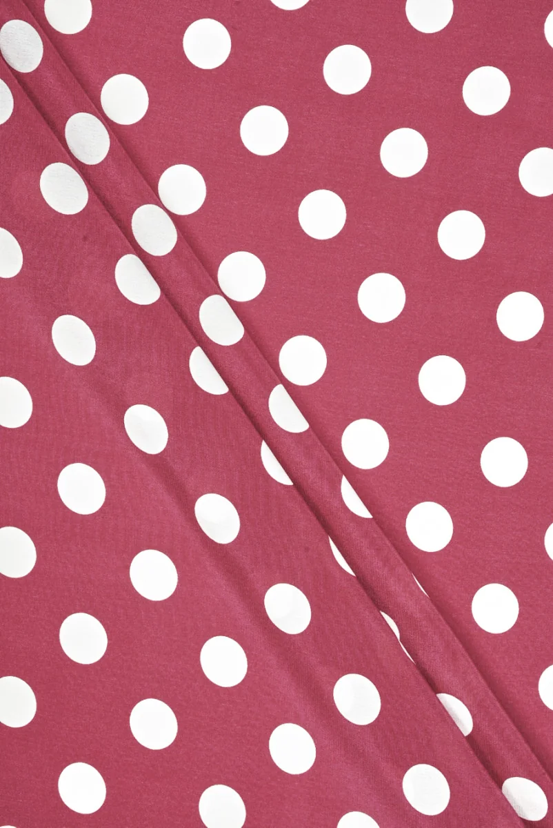 Taliansky krep 100% hodváb v malinovej farbe s béžovým bodkovaným motívom. Vzor je pravidelne rozmiestnený a má priemer 2,1 cm. Látka je tenká, ľahká, vzdušná, mäkká a neelastická. Bude ideálny na šitie blúzky, košele, šiat a sukne. Nadčasový vzor pre všetkých, ktorí milujú "klasiku"