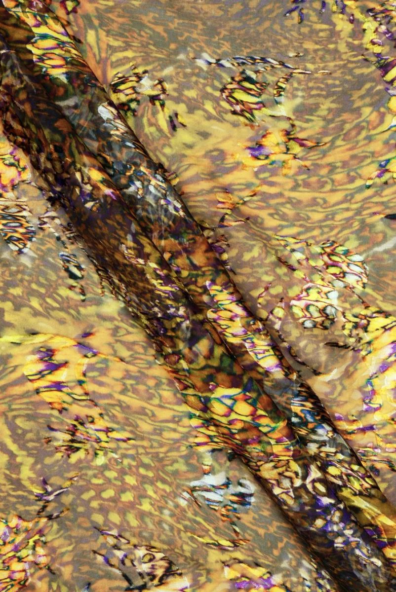 Talianska látka vyrobená z 50 % prírodného hodvábu a 50 % viskózy, tkaná v väzbe devore. Materiál je kombináciou saténových vzorov so šifónovým pozadím, motív pripomína leopardí vzor a je udržiavaný vo farbách fialovej, zelenej a červenej. Látka je vyrobená zo 100% prírodných vlákien, vďaka čomu sa veľmi pohodlne používa. Fantastický návrh na jesenné outfity.