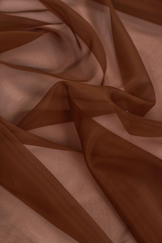 Talianska 100% hodvábna látka v svetlohnedej farbe. Prírodná hodvábna organza je tenká, priehľadná, ale tuhá tkanina s jemným leskom charakteristickým pre hodvábne tkaniny. Ideálne na šitie šiat, blúzky, košele, sukne.