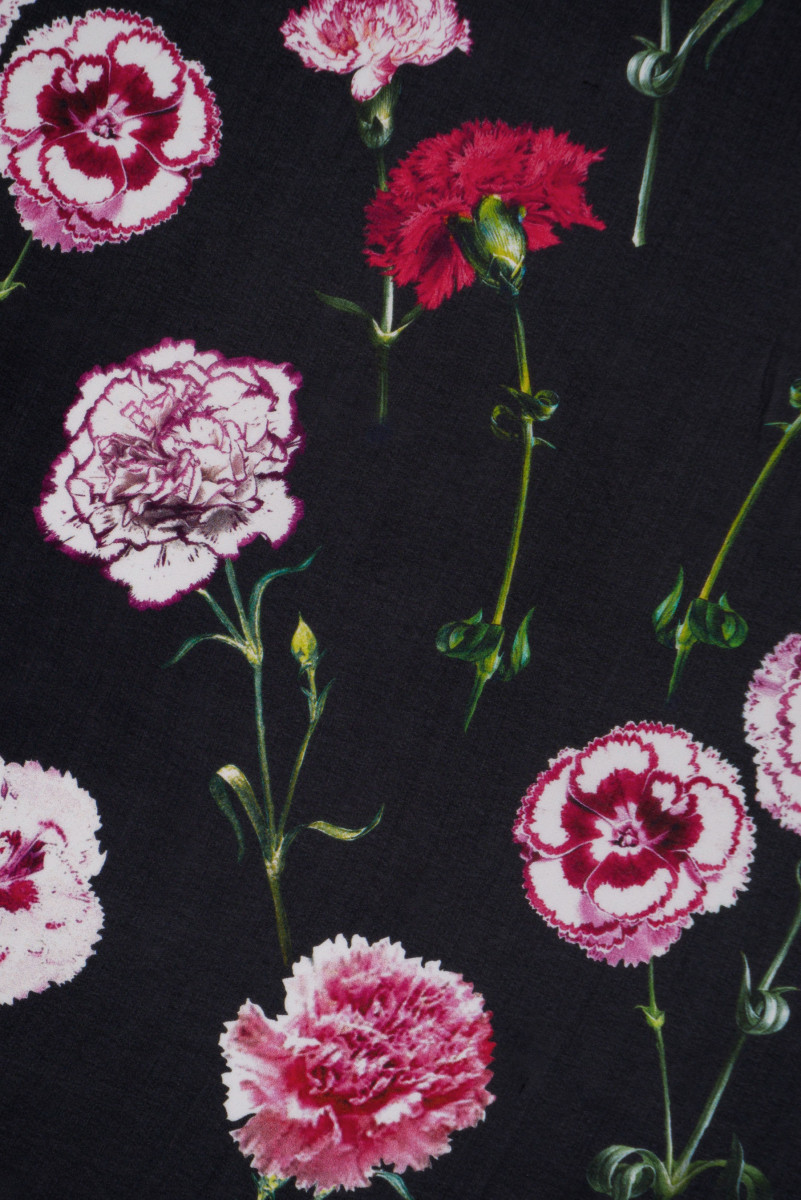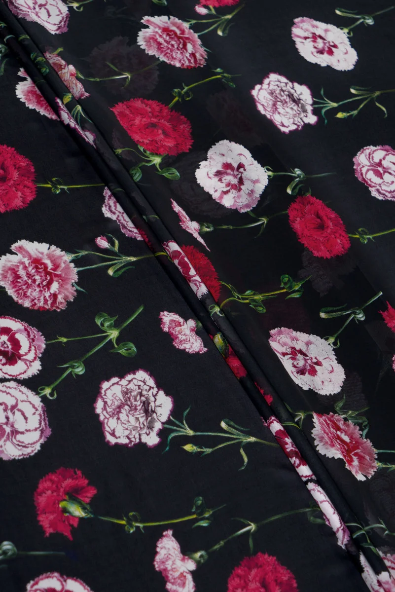 Šifón vyrobený z prírodného hodvábu je veľmi jemná, vzdušná a priehľadná tkanina. Ideálne pre vzdušné šaty a blúzky. Neelastická tkanina. N čiernych klinčekov na pozadí.