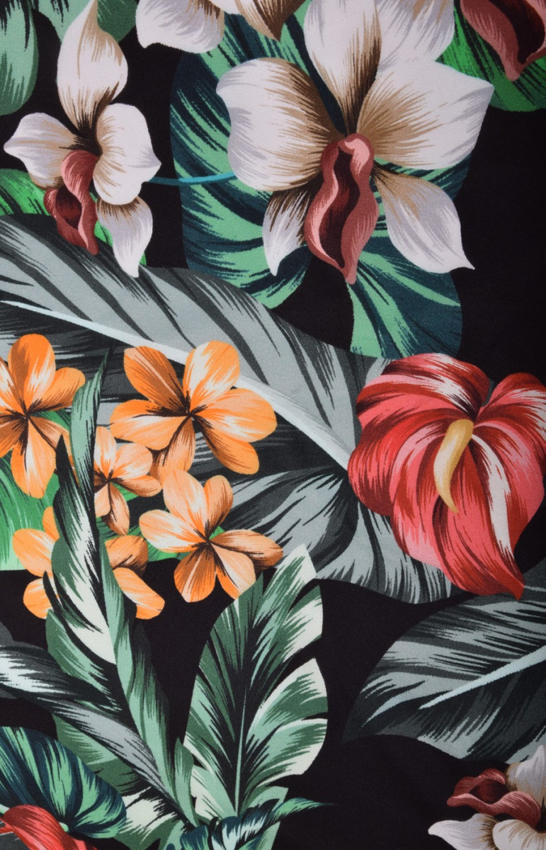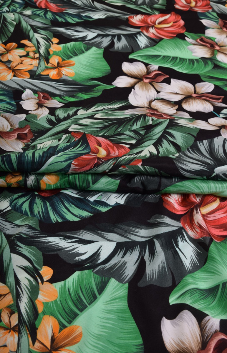 Hodvábny krep s elastanom je jemná tkanina, zamatová na dotyk, polopriehľadná. Potlač džungle, môžete vykúzliť vzdušné šaty, jemné blúzky, pareo. Odporúčame použiť podšívku.