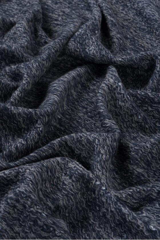 Sveterová pletenina pozostávajúca z 2 vrstiev - tesnej spodnej vrstvy z akrylu vo farbe ecru a vrchnej vrstvy voľne tkanej z vlnených nití v šedej a tmavomodrej farbe (melanžový efekt). Odporúčame z neho šiť voľné vesty, svetre alebo ako dekoračnú látku.