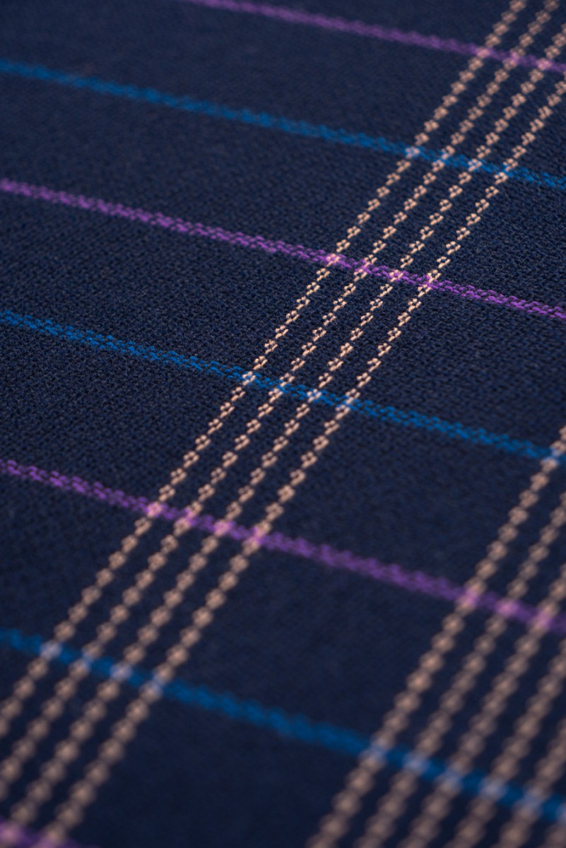 Veľmi originálny návrh na tenší kabát alebo bundu za skvelú cenu! Vlnená tkanina, pevne tkaná v jemnej žakárovej väzbe, obojstranná. Na tmavomodrom pozadí zvislé pruhy modrej a vresovej farby, každých 5 cm tenký prúžok lurexovej nite (na jednej strane látky), cez tenký béžový prúžok v obojstrannej správe -45 cm od okraja. Tkanie by malo byť šité po obvode, nie je potrebná žiadna podšívka.