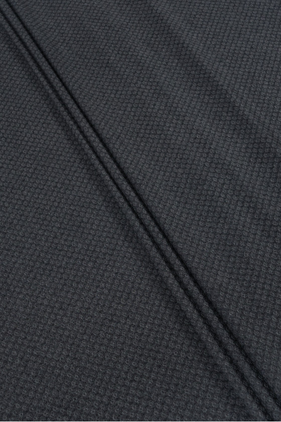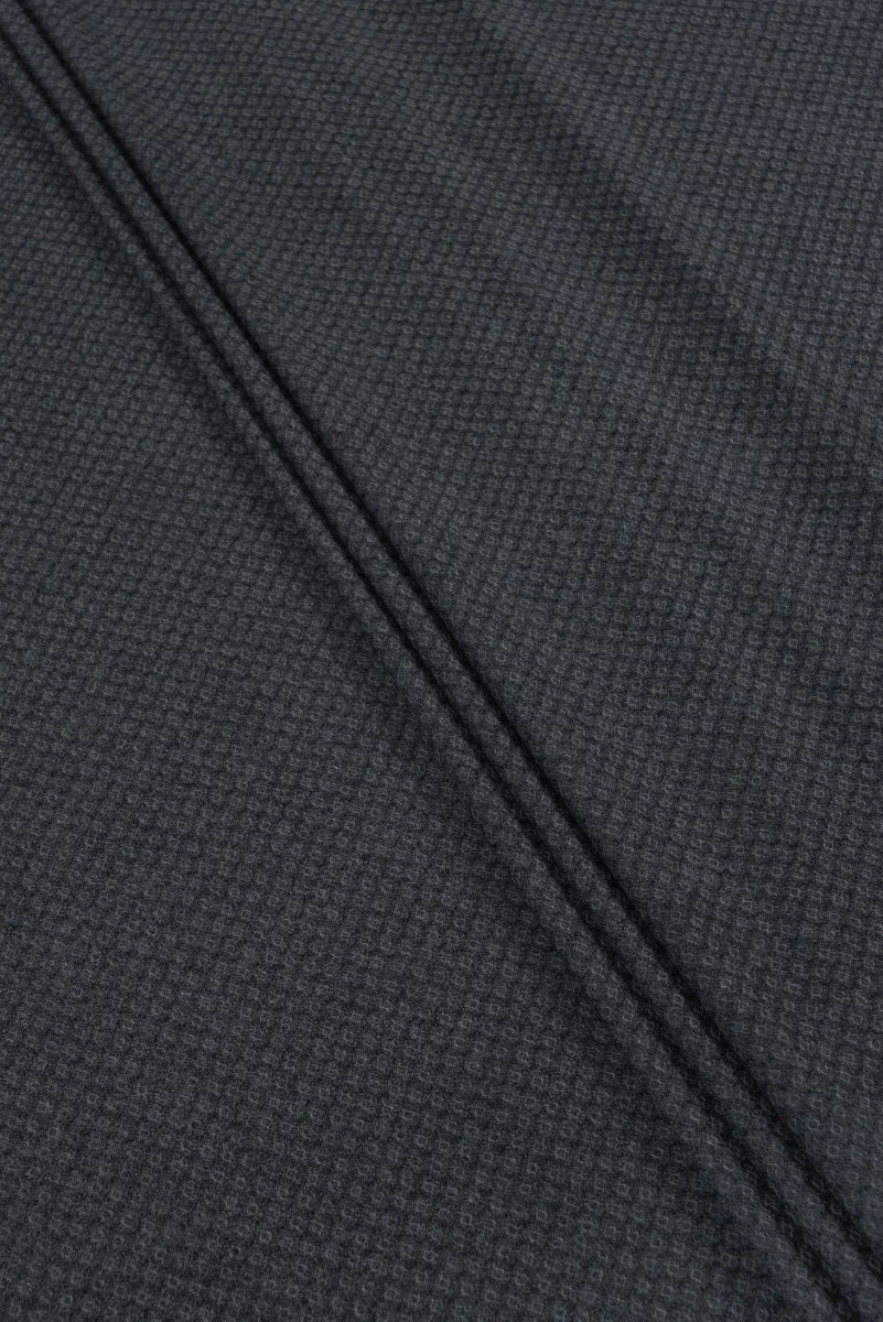 Talianska kostýmová vlna v šedej - obojstranná. Na jednej strane je motív "šupín" a na druhej strane motív slzy a kosoštvorcov. Mäkká, mäsitá, neelastická tkanina žánru jeseň-zima - ideálna na šitie kostýmu, obleku, nohavíc, sukne, šiat.