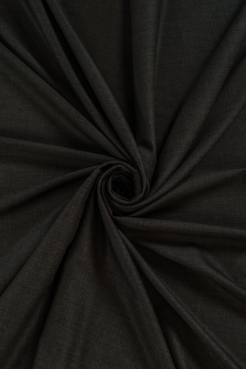 Talianska kostýmová vlna v šedo-olivovej farbe - melanž. Tkanina je mäkká, mäsitá, neelastická, matná.