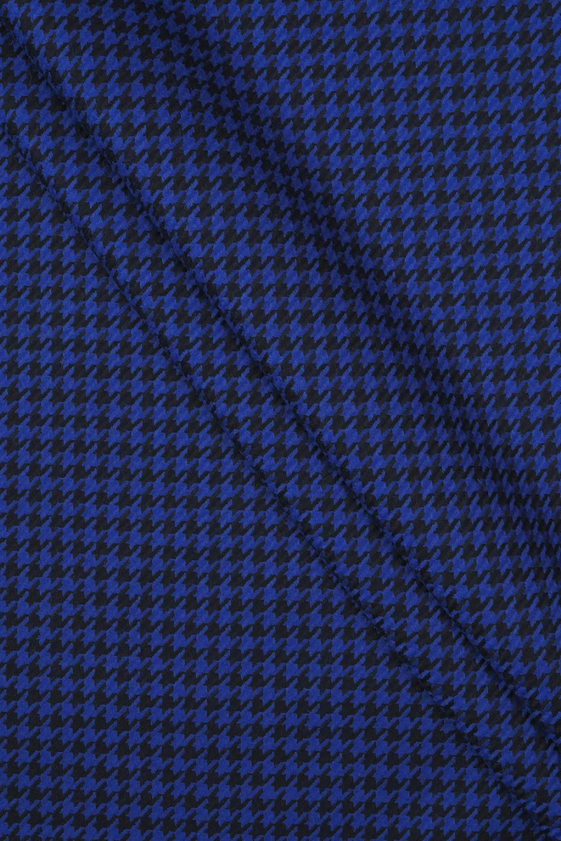 Talianska kostýmová vlna s motívom nevädzovo modrej a čiernej kuracej nohy, veľkosť 1 cm. Hrubšia, mäkká, neelastická tkanina jesenno-zimného druhu.
