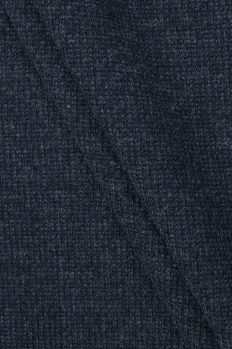 Talianska, hrubá svetrová vlna v modrej a námorníckej modrej melanži. "Dvojitá" tkanina s rebrovou väzbou na jednej strane (0,5 cm) a hladká na druhej strane, pripomínajúca dusenú vlnu.