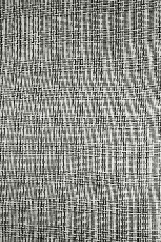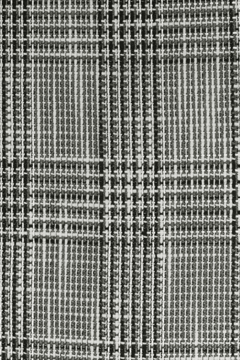 Talianska, hrubšia kostýmová vlna s veľkým károvaným motívom (10 cm) v čiernej, šedej, striebornej a écru. Hrubšia, neelastická látka s väzbou pripomínajúcou látku chanel.