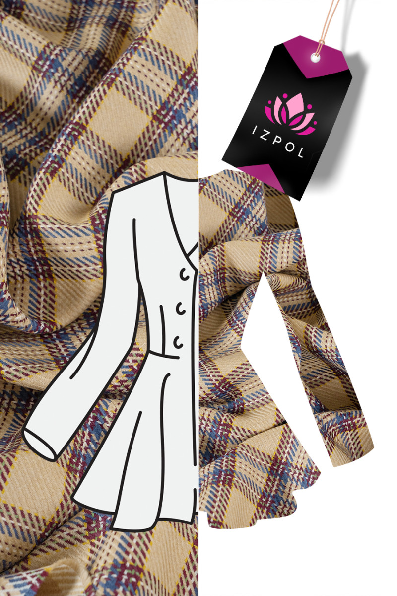 Talianska kostýmová vlna v svetlobéžovej farbe s károvaným motívom širokým asi 5 cm v bordovej, modrej a écru. Hrubšia, mäkká, neelastická tkanina jesenno-zimného typu so širokou keprovou väzbou. Fantastický návrh pre ľudí, ktorí majú radi pokojné farby, ale originálne farebné kombinácie. Látka je ideálna na šitie saka, sukne alebo šiat.