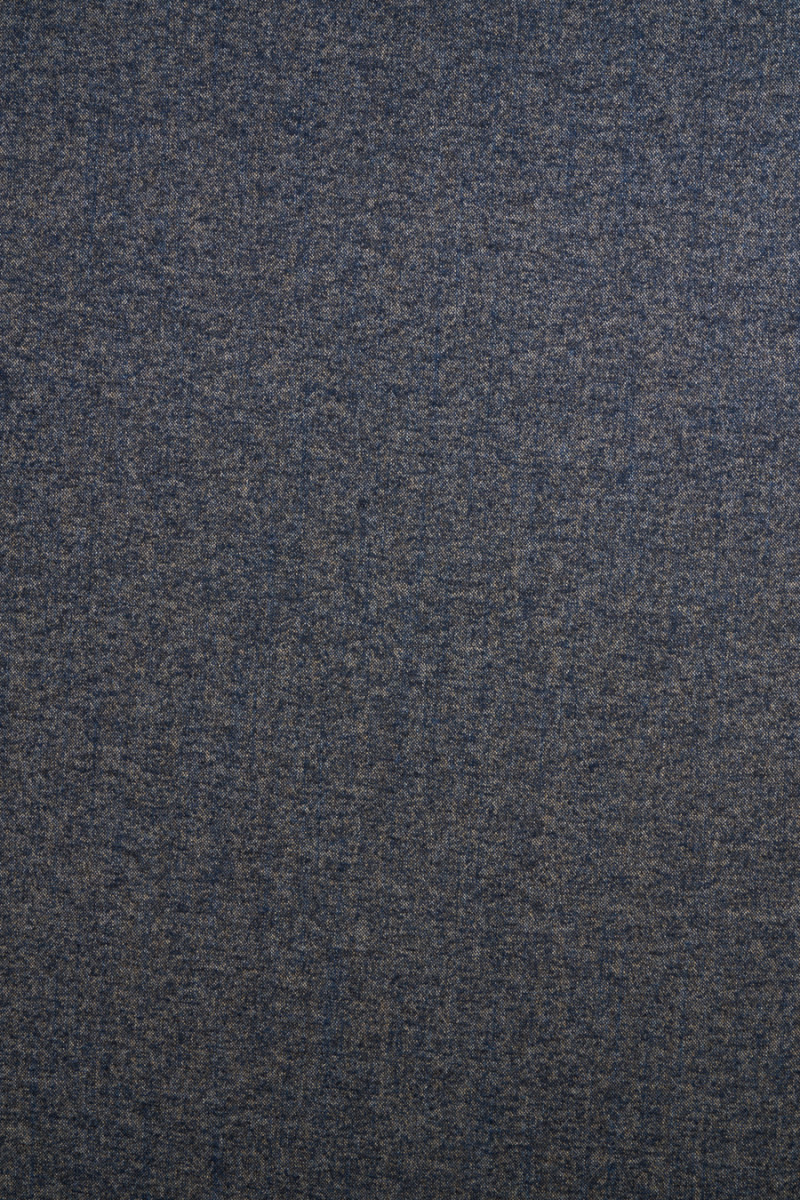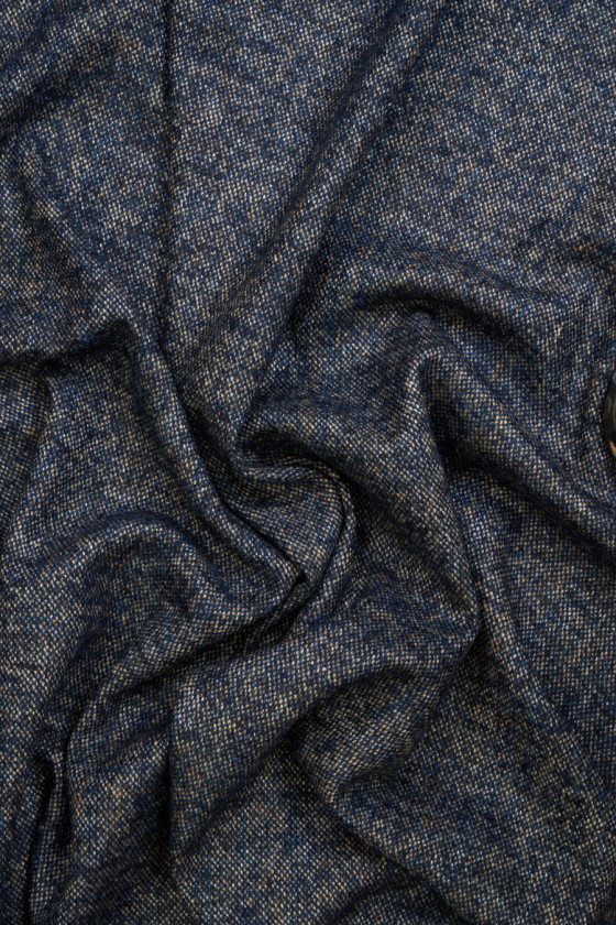 Talianska melanžová kostýmová tkanina v námorníckej modrej, ecru, béžovej a šedej farbe. Hrubšia tkanina, jesenno-zimného typu, neelastická, ale jemne pracuje, tkaná hlavne z prírodných vlákien, vrátane vlny, ktorá poskytuje teplo. Zaujímavý návrh na šitie kostýmu, sukne, nohavíc a tenkého kabáta.