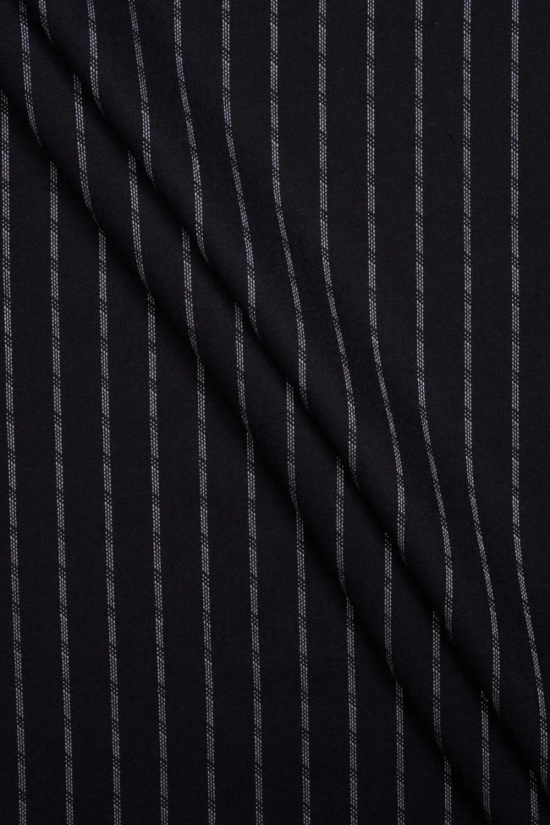 Talianska kostýmová tkanina tkaná z vlny v čiernej farbe s bielymi pruhmi. Pásy sú rozmiestnené každé 2 cm. Tkanina je mäkká, mäsitá, ľahko pracuje na nitiach a je obojstranná. Ideálne na šitie kostýmu, obleku, nohavíc, sukne, šiat.