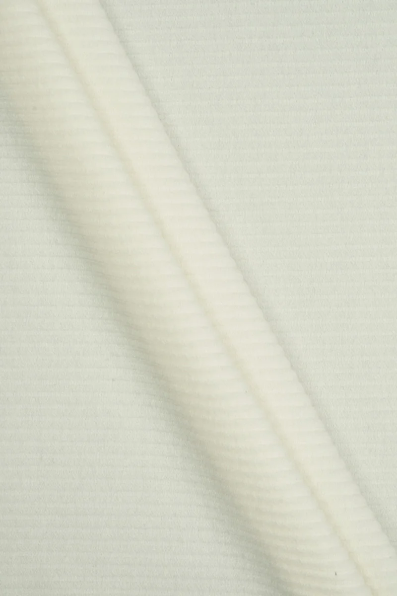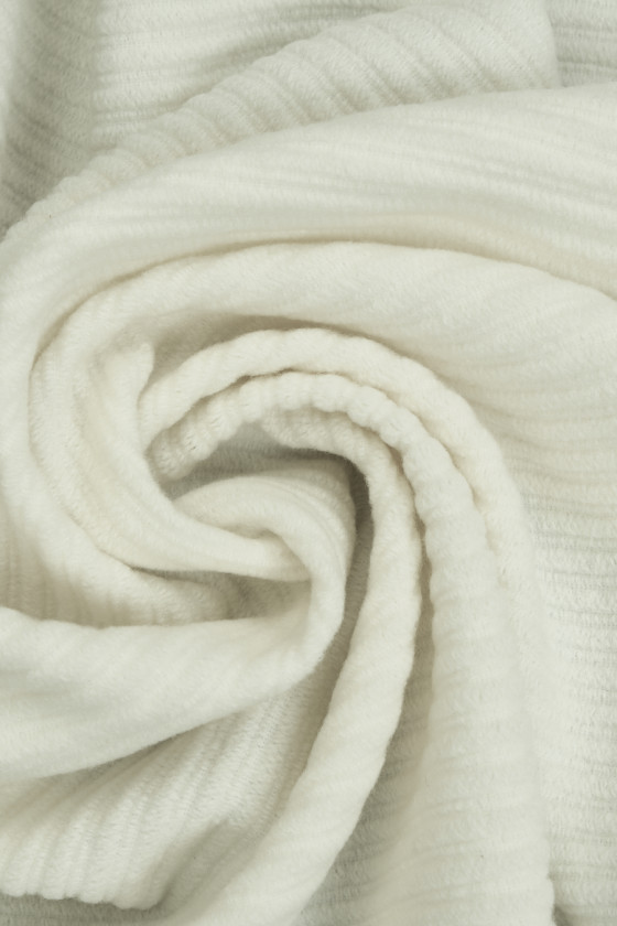 Talianska krémová svetrika tkaná z vlny vergin s prímesou polyamidu a viskózy. Veľmi mäsitá látka s rebrovou väzbou širokou 0,5 cm. Vlna ju veľmi zahreje a prímes polyamidu jej dodáva odolnosť. Fantastický návrh na šitie jesenno-zimnej mikiny, svetra alebo ponča, bude dobre fungovať aj ako dekoratívna látka.