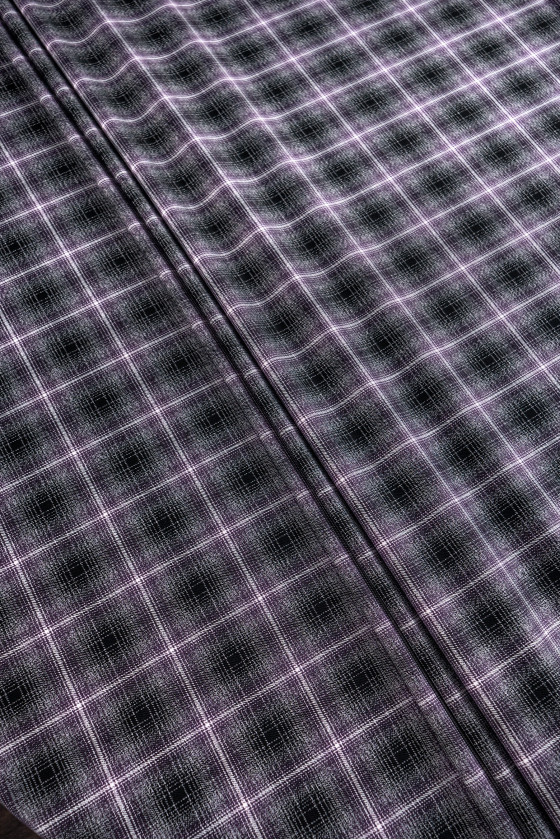 Talianska kostýmová látka s károvaným motívom (6 cm) v čiernej, šedej a fialovej farbe. Mäkká tkanina s hustou väzbou pripomínajúcou vlnu. Ideálne na šitie obleku, šiat, nohavíc alebo sukne, saka.