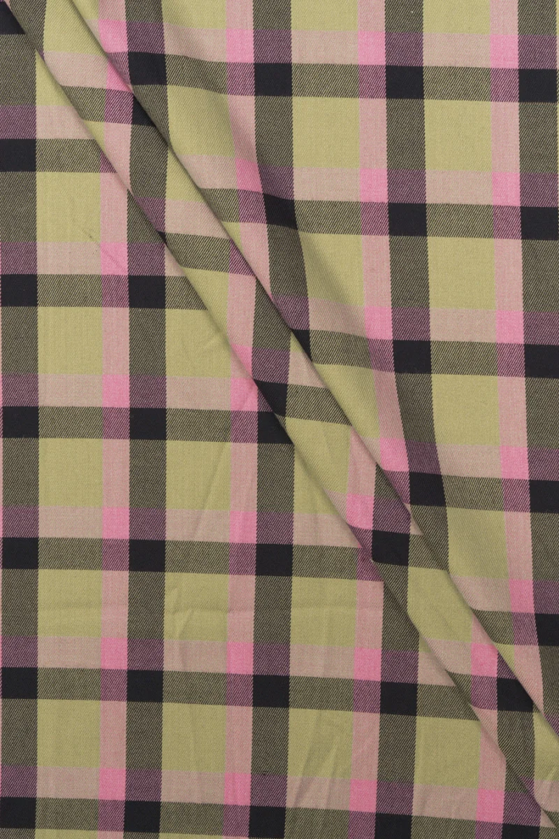 Talianska kostýmová látka v olivovo zelenej farbe s veľkým károvaným motívom (10 cm) v čiernej a ružovej farbe. Krásna farebná kombinácia pre tých, ktorí sledujú najnovšie trendy. Mierne elastická tkanina s kompaktnou väzbou a hladkým povrchom. Fantastický návrh na šitie saka, obleku, klasických šiat alebo sukne.
