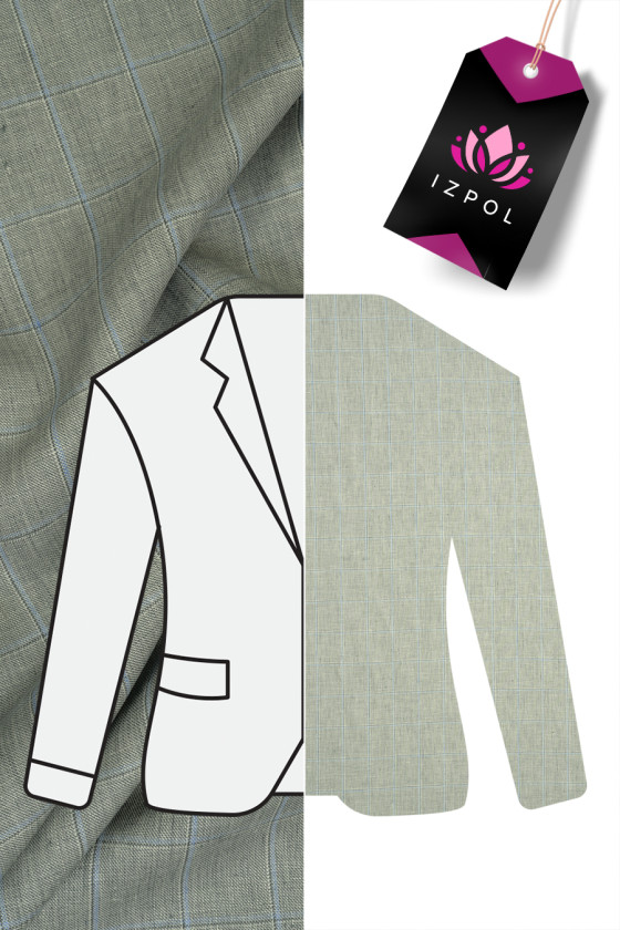 Talianska 100% ľanová tkanina s kockovaným vzorom, šírka 4,5 cm. Celé je to v tlmenej zelenej farbe s krémovou niťou a modrým károvaným motívom. Veľmi zaujímavý návrh na šitie letného obleku, saka, nohavíc alebo saka.