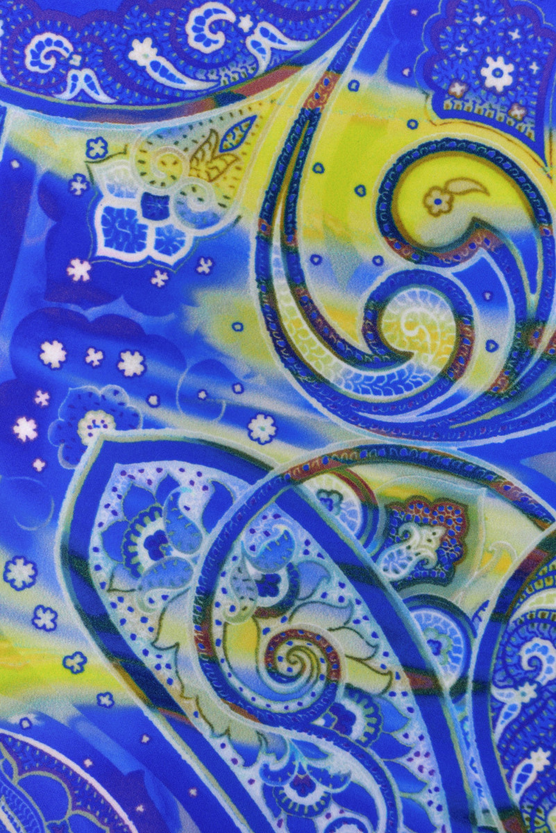 Talianska elastická lycra pletenina v chrpovej modrej farbe s piercingovou žltou farbou a orientálnym motívom paisley. Tkanina s kompaktnou, hladkou väzbou, veľmi elastická - ideálna pre ľudí, ktorí majú radi oblečenie objímajúce telo a orientálne vzory. Je ideálny na šitie každodenného oblečenia, ako aj plaviek, pretože je pohodlný a rýchloschnúci.