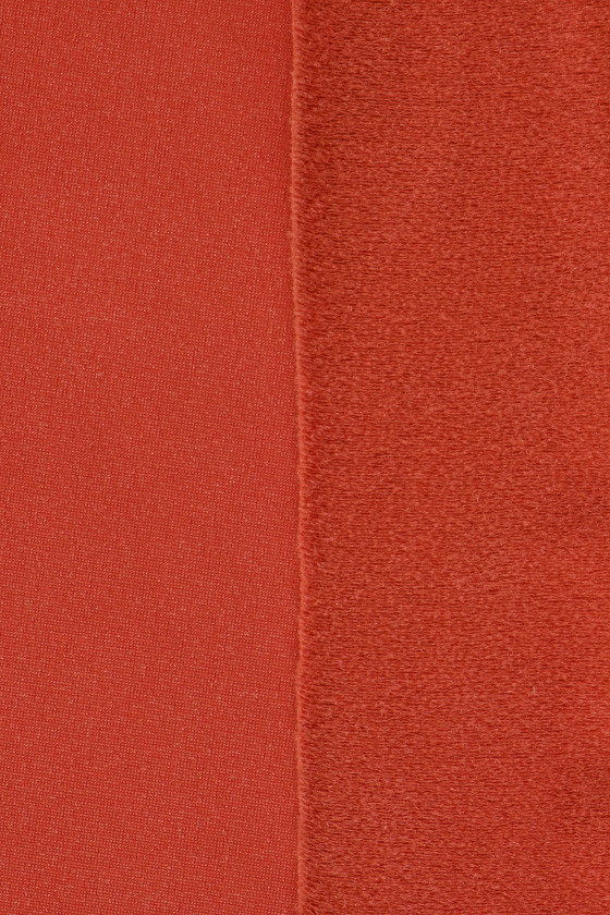Talianska Lycra brúsená červenou farbou s jemným kovovým leskom. Pletená látka na pravej strane je hladká a matná, zatiaľ čo ľavá strana bola poškriabaná, vďaka čomu sa na spodnej ploche vytvorilo mäkké a veľmi príjemné na dotyk. Materiál je teplý a pružný, ideálny pre jesenné a zimné dni.