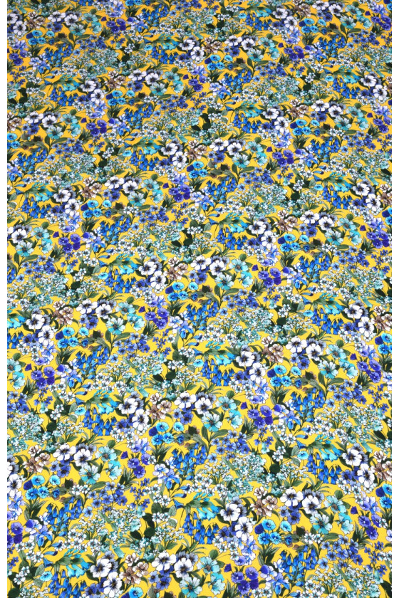 Šaty viskóza s farebnou lúkou, mäkkou a dobre zakrytou, stredne hrubou. Odporúčame z neho šiť letné šaty, blúzky a sukne. Nie je priehľadný, môžete ho šiť bez podšívky. Veľmi kvalitná tkanina. Gramáž je vhodná aj na šitie dámskych košieľ. Pred šitím odporúčame predzmrštiť, pretože viskózové tkaniny môžu mať tendenciu sa zmršťovať. Farby: na žltom pozadí - biele, fialové, modré kvety.