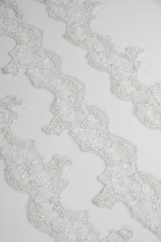 Fenomenálna, talianska čipkovaná páska s korálkami v optickej bielej farbe. Motív malých kvetov je našitý na bielom tyle. Ideálne na konečnú úpravu svadobných a večerných látok.