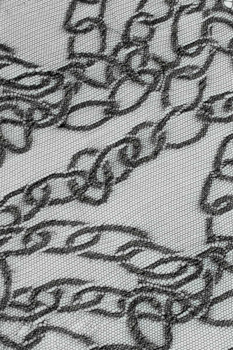 Talianska čipkovaná páska v čiernej farbe so striebornou lurexovou niťou. Dokončené na oboch stranách zubom (na vyrezanie). Motív reťaze. Šírka: 30 cm.