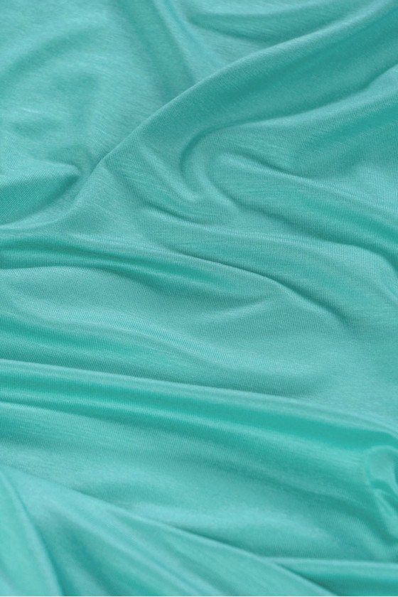 Talianska viskózová pletenina v tyrkysovej farbe - veľmi dobrá kvalita. Mäsitý, elastický s miernym leskom. Ideálne na šitie blúzky alebo trička.