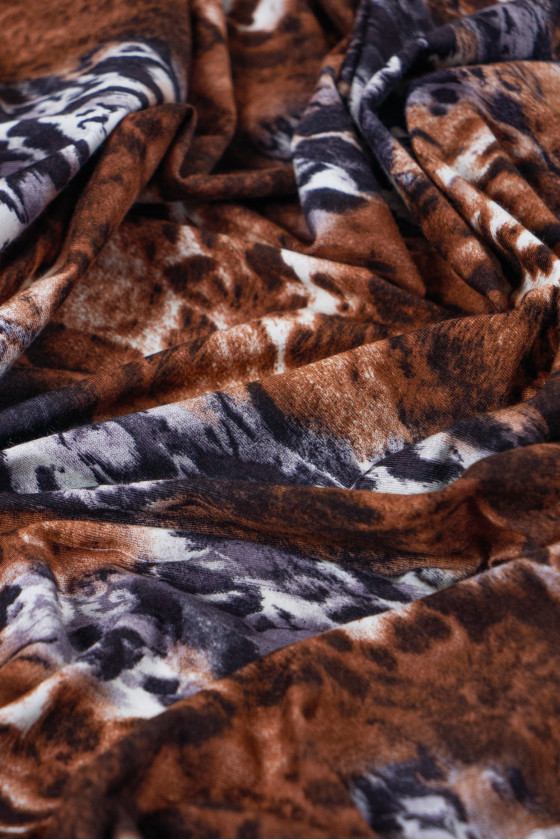 Talianska viskózová pletenina so vzorom hnedošedej hadej kože. Viskózový úplet je prírodná tkanina (získaná z celulózy), veľmi mäkká a vzdušná. Látka je ideálna na šitie letných šiat, blúzky alebo sukne.