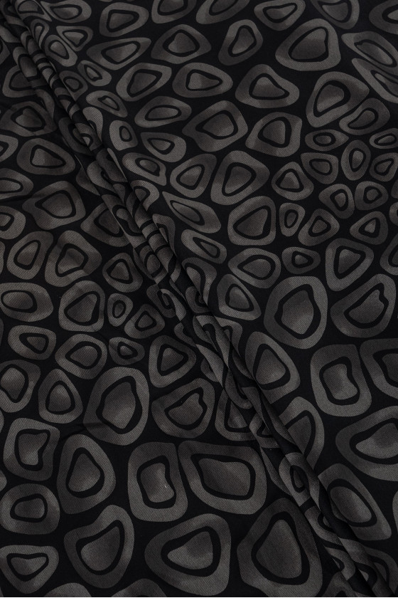Taliansky džersejový acetátový úplet v čiernej farbe s motívom sivých, geometrických vzorov pripomínajúcich nášivky veľké asi 6 cm. Džersejový úplet je nepriehľadný, jemne riasený úplet, ktorý je možné šiť bez podšívky. Je ideálny na každodenné šaty, sukne, bundy.