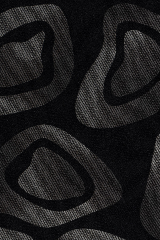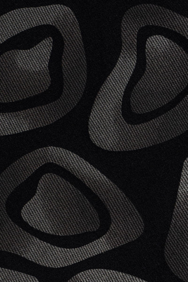 Taliansky džersejový acetátový úplet v čiernej farbe s motívom sivých, geometrických vzorov pripomínajúcich nášivky veľké asi 6 cm. Džersejový úplet je nepriehľadný, jemne riasený úplet, ktorý je možné šiť bez podšívky.